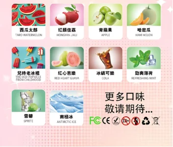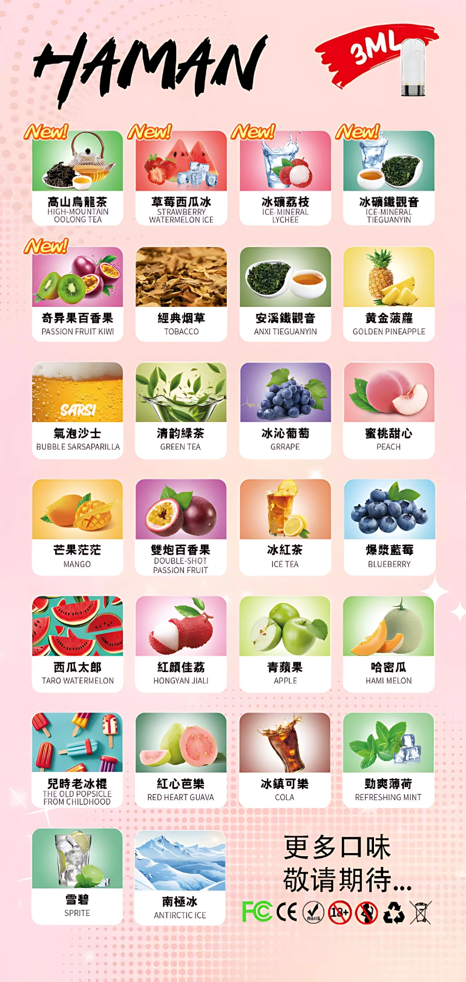 南極冰, 經典煙草, 鐵觀音, 鳳梨百香果, 绿豆冰棍, 清韵緑茶, 冰沁葡萄, 蜜桃甜心, 芒果茫茫, 酸甜百香果, 茉莉龍井, 爆漿蓝莓, 西瓜, 荔枝, 青蘋果, 哈密瓜, 冰棍, 芭樂, 冰鎮可樂, 薄荷