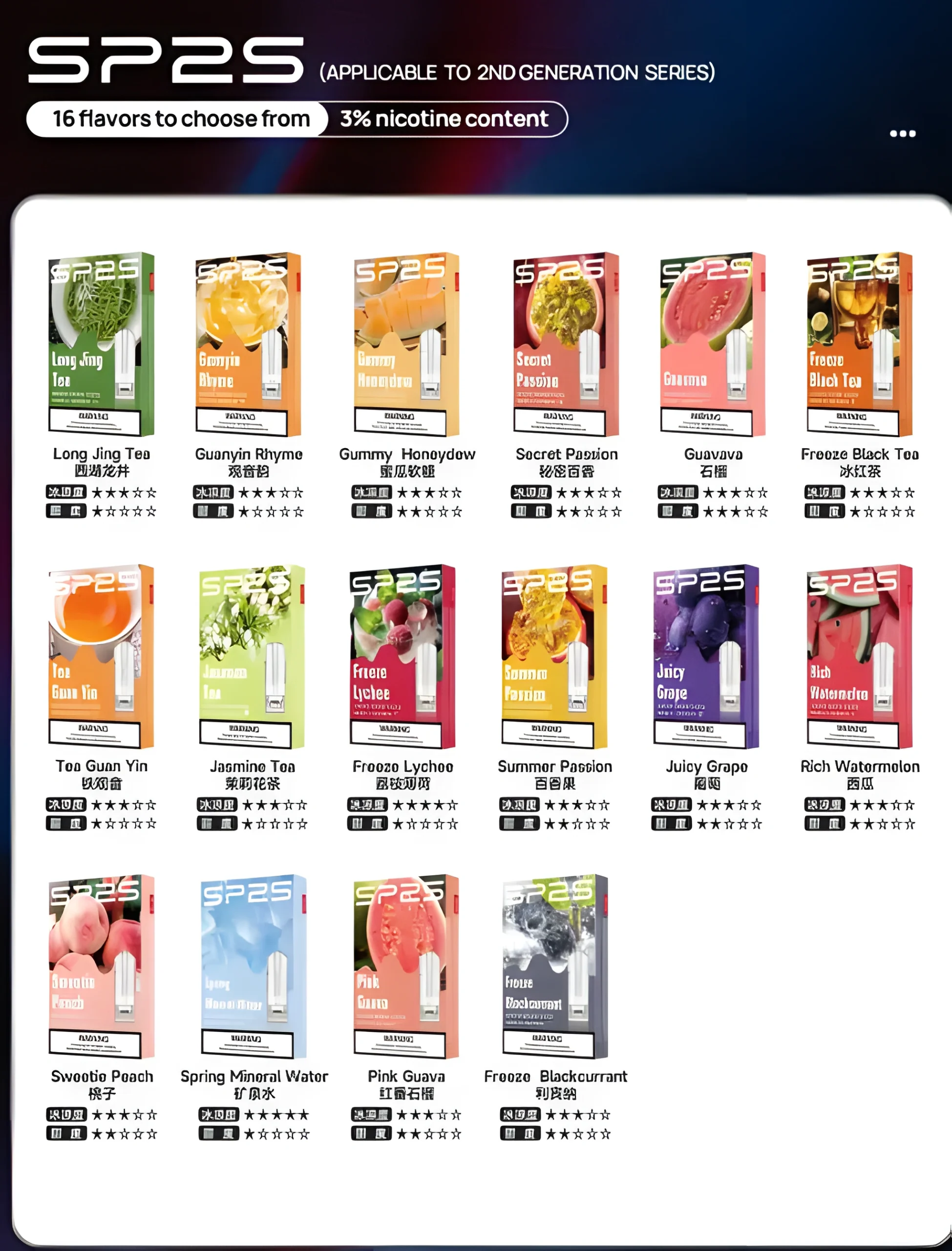 桃子, 西瓜, 葡萄, 利賓納, 蜜瓜軟糖, 秘密百香, 西湖龍井, 石榴, 百香果, 礦泉冰, 冰紅茶, 紅芭樂, 茉莉花茶, 荔枝薄荷, 觀音音
