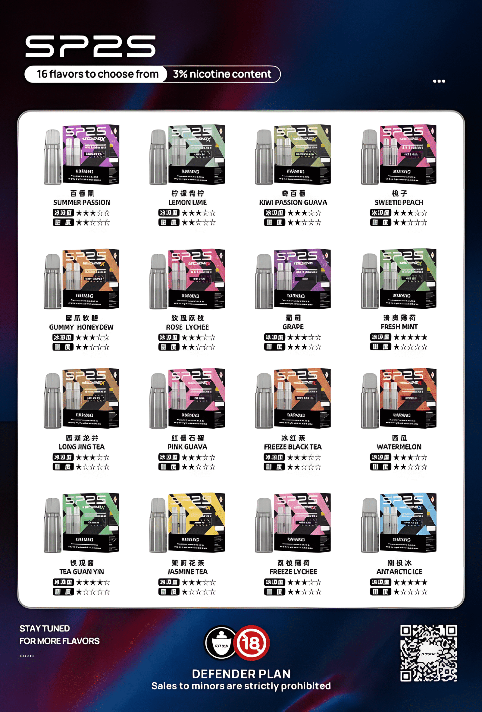 百香果, 柠檬青柠, 奇百番, 桃子, 蜜瓜软糖, 玫瑰荔枝, 葡萄, 清爽薄荷, 西湖龙井, 红心芭樂, 冰红茶, 西瓜, 铁观音, 茉莉花茶, 荔枝薄荷, 南极冰
